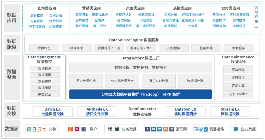 基于融合数据湖理念,构建金融大数据平台。该平台通过数据源、数据采集平台、数据管理平台、数据应用平台和客户端多平台融合建设,提供数据集中化采集、整合、加工、分析和统一的数据服务,实现大数据治理和管控,可进行全域数据采集和数据管理。构建数据加工平台,实现批量、实时数据加工和数据分析挖掘。同时建立了数据服务中台,帮助金融机构提升数据分析和数据场景化应用能力,助其搭建业务与数据之间的桥梁,充分释放数据价值。